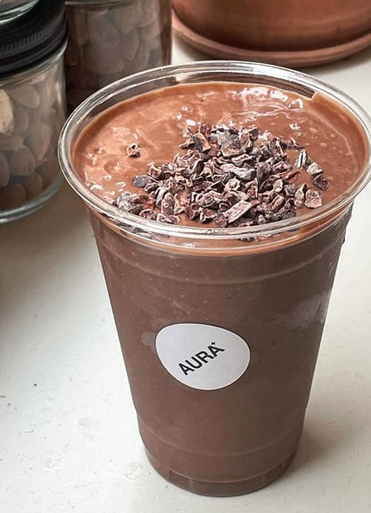 L’adresse la plus wellness de Paris s’est récemment installée au cœur du Marais. Et chez Aura, le smoothie est un véritable lifestyle ! Même si on y compte une flopée de recettes pour toutes les routines et objectifs – purify, clear, hydrate, recover ou encore skin care – notre véritable coup de cœur reste le Cacao Therapy, très gourmand mais aussi très healthy. Son mélange de cacao cru, maca, banane, protéines végétales, graines de chanvre, caramel de datte et lait de cajou maison en fait un allié idéal pour se remettre d’une séance de sport et renforcer ses muscles tout en se faisant plaisir (sans sucres ajoutés).
