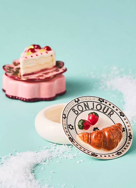 Peut-on faire plus adorable que ces délicieuses boîtes à bibelots en grès signées Anthropologie ? L’une se pare d’un combo croissant-fraise tandis que l’autre est ornée d’une alléchante part de gâteau en reliefs et peints à la main : on a faim rien qu’à les regarder. Une touche maximaliste et fun à déposer dans tous les recoins de la maison pour garder son âme d’enfant…
