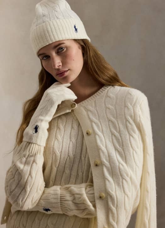 Envie de se sentir comme une Pinterest girl ? Difficile de faire plus juste que Ralph Lauren en hiver, surtout avec ce bonnet blanc en laine et cachemire torsadés au petit logo discret. Un accessoire passe-partout qui convient à tous les moods du jour.