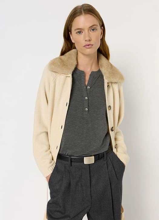 Notre coup de cœur de la sélection, c’est ce gilet beige en cachemire Gérard Darel au col orné de fausse fourrure. Le petit plus qu’on a adoré, ce sont ces mitaines à accrocher au bout des manches, à la fois pratiques et cool. On l’imagine déjà sur une tenue effortless, ou associé à un pantalon tailleur gris chiné ceinturé et un simple t-shirt blanc.
