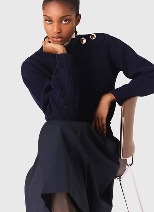 Sur les réseaux, difficile de passer à côté du retour du pull inspiré du vestiaire marin. Une tendance qu’on adopte sans hésiter avec ce modèle Maje. En laine bleu foncé, il coche toutes les cases du bon essentiel, qu’on imagine porté avec une jupe longue et de grandes bottes pour une allure affirmée.