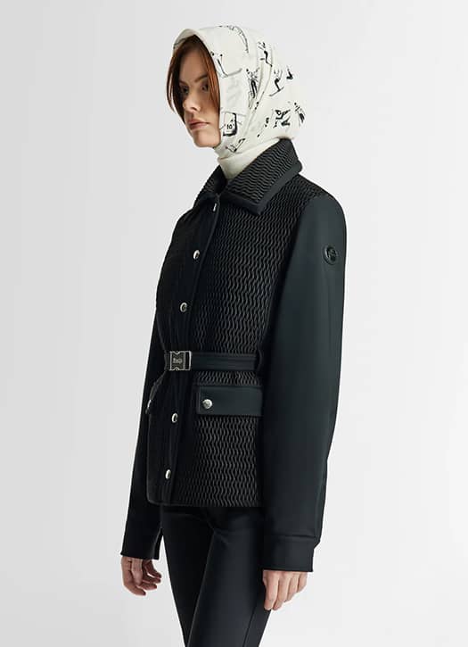 En attendant de rejoindre les pistes, Fusalp s’invite dans le vestiaire avec une allure chic et affirmée. La veste Diamara, près du corps et à porter ceinturée, se décline en noir smoky et promet de tenir chaud même quand le thermomètre frôle les –5 degrés. On l’imagine en total look Courchevel pour sortir : lunettes de soleil, foulard, pantalon noir, bottes hautes.