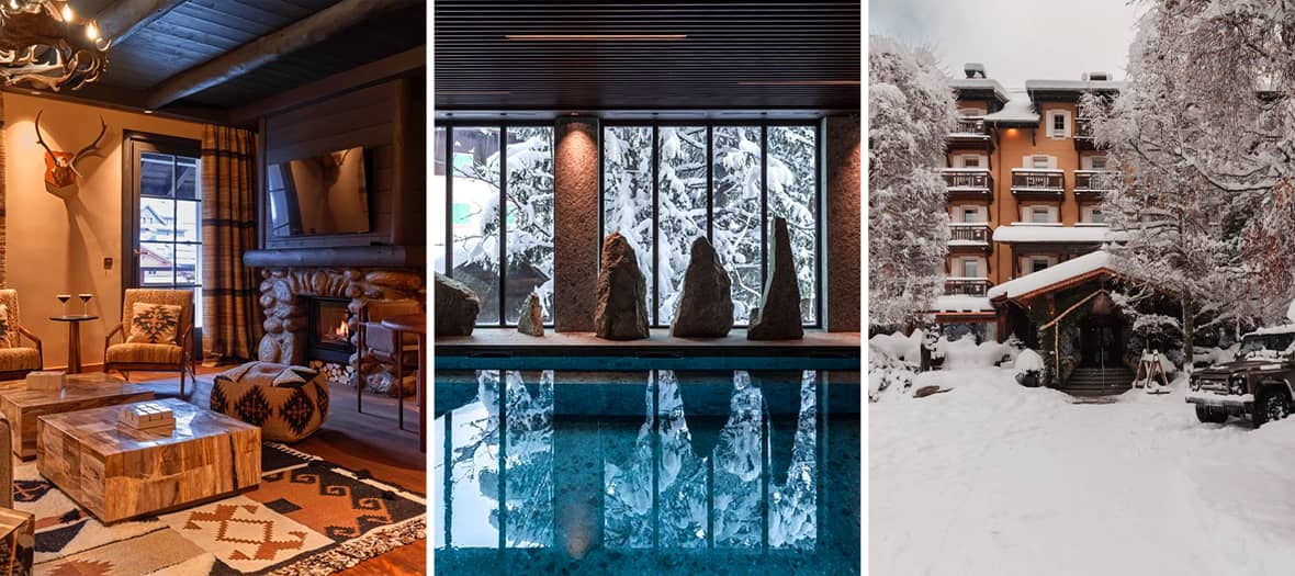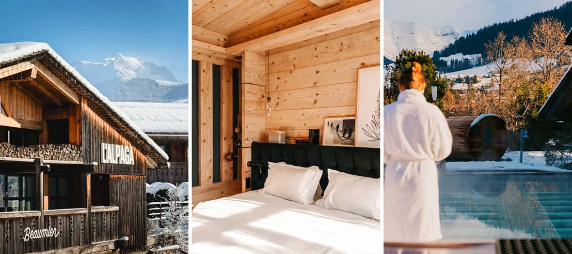 À flanc de montagne, comme suspendu entre forêts et cimes, L’Alpaga contemple Megève depuis ses hauteurs face au Mont-Blanc et à la chaîne des Aravis. Ce 5 étoiles de la collection Beaumier conjugue l’élégance alpine à l’âme contemporaine d’un refuge confidentiel. Éparpillant ses espaces dans une dizaine de chalets traditionnels, l’hôtel reste en lien avec la nature : chemins enneigés, senteurs résineuses et, çà et là, la chaleur du bois brut. Rénové par le studio Charles & Co, il revendique l’authenticité : murs habillés de pin sablé, pierres naturelles et tissus en laine signent un décor finalement assez sobre, mais sophistiqué. Les 33 chambres et suites, toutes tournées vers les sommets, perpétuent ce dialogue entre confort et horizon. Tout comme les chalets à louer, plébiscités par les tribus : ils hébergent en toute convivialité jusqu’à 15 personnes. Le spa en pierre sombre cache une piscine intérieure, un hammam, une salle de sport et des cabines de soins signées Holidermie. Dehors, bain chaud suédois, sauna tonneau et piscine chauffée toute l’année s’ouvrent aux paysages.