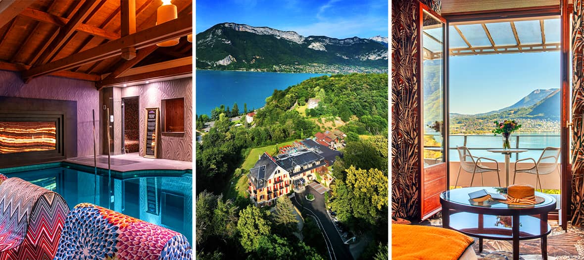 Sur les rives du lac d’Annecy, entre eaux limpides et massif des Bauges, cet hôtel 4 étoiles déploie le charme d’une maison savoyarde des années 1930. Bâtie en 1860 comme pension de famille, elle adopte ensuite un style Art déco. Saviez-vous que le chef Marc Veyrat y fit ses débuts ? En 1998, Véronique et Pascal Droux reprennent la demeure, alors tombée en désuétude et, forts de leur détermination, lui redonnent tout son éclat. Les 52 chambres étonnent par leur univers coloré, parfois égayé de grands portraits Art nouveau, mariant bois brun et lumière douce, habillant leur sol de moquettes personnalisées et, surtout, promettant de somptueuses vues sur le lac ou le Mont Veyrier. Attenantes à l’établissement, deux villas taquinent les tribus : Comme un jardin empreinte d’une atmosphère bucolique, et Comme un voyage, poétique invitation à s’évader. Le spa de 200 m² prolonge la sérénité : sept cabines pour des soins Talgo Spa, Coelho Beauty ou Douceur du Lac, bassin de balnéothérapie et douche sensorielle, sauna et hammam, tout y est.