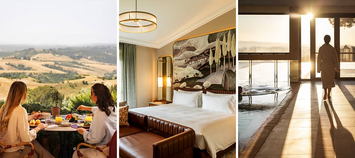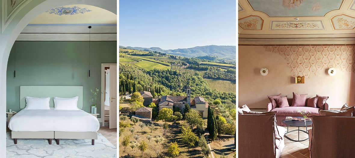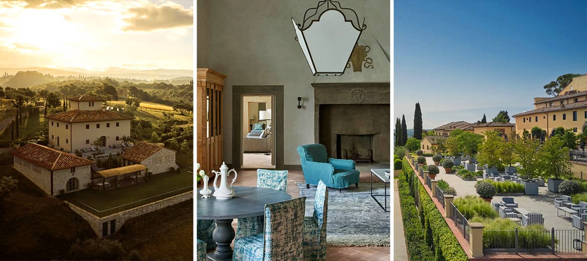 Le domaine de 740 hectares offre une expérience immersive dans la beauté naturelle et culturelle de la Toscane, entre vignes, oliveraies et jardins à l’italienne. L’hôtel compte 50 chambres et suites somptueuses, décorées avec des tons clairs, des matériaux nobles et conservant les sols en terre cuite et plafonds voûtés d’origine, offrant des vues panoramiques sur les collines environnantes. Les espaces communs invitent à la détente dans un décor élégant, entre le lobby orné de candélabres sculpturaux et les terrasses où il fait bon prendre un verre en admirant le coucher de soleil.