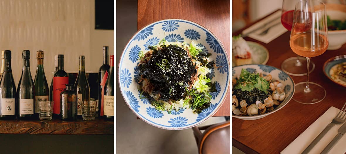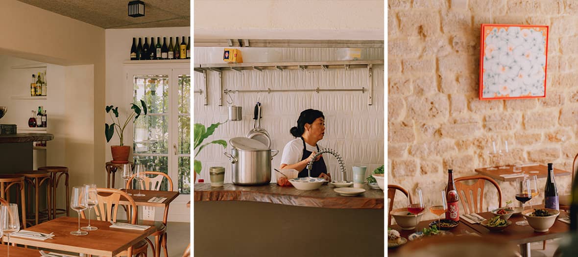 Derrière les fourneaux de la cuisine ouverte, la cheffe coréenne Ji-Hye Park, connue pour son restaurant OMA ( = maman en corréen). Sa mission ? Élaborer de délicieux plats afin de sublimer les vins naturels et sakés à la carte. La cheffe imagine des assiettes chaleureuses, gourmandes aux accents coréens et évoluant au rythme des saisons. Sur la carte du moment, le maquereau de ligne mariné (17 €), les œufs cocottes au parmesan (11 €) ou encore le foie gras maison (18 €) ouvrent le bal. Puis place aux choses sérieuses avec un steak de chou fleur gratiné au comté très gourmand (21 €) ou un réconfortant pot-au-feu (27 €).